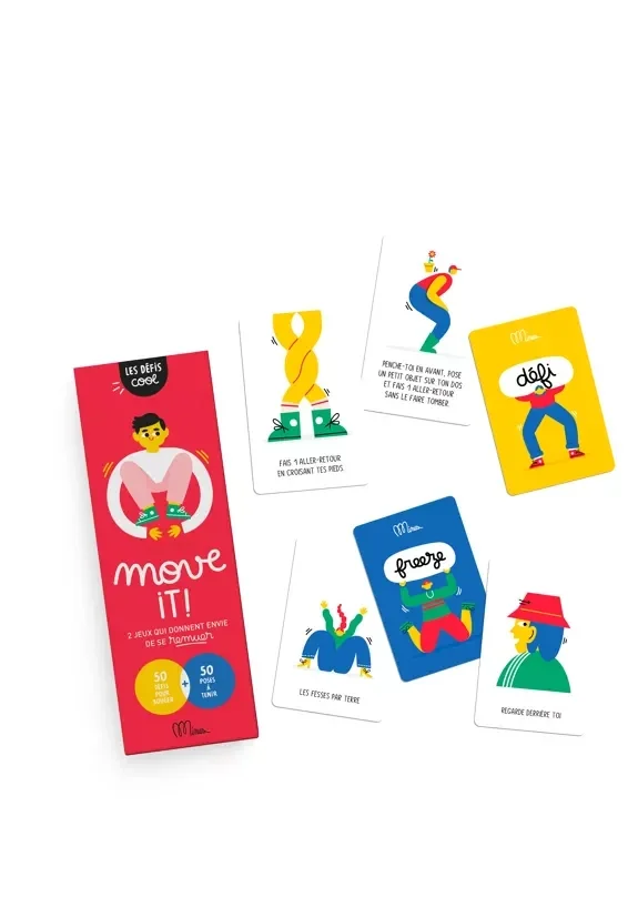 Ramper sans s'aider ni de ses mains, ni de ses pieds, avancer en regardant entre ses jambes, écrire son prénom avec ses fesses... 50 cartes pour se lancer des défis amusants et tout en mouvement !