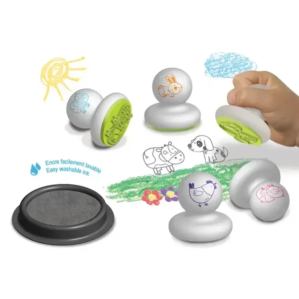 Un pack sur le thème de la ferme contenante 5 tampons en mousse et un encreur maxi format. La poignée ronde facilitera la prise en main. Ce coffret permettra aux tout-petits de découvrir le plaisir du tampon tout en les aidant au développement leur motricité fine. Contient 5 tampons en mousse et 1 encreur maxi format gris Ø 5,5 cm. Taille des empreintes environ 4 cm, un lapin, une vache, une poule, un chien et un cochon.