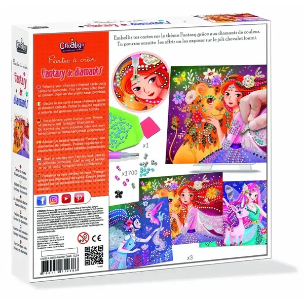 Un coffret créatif sur le thème fantastique de diamants. Les enfants complèteront les belles cartes à l'aide des petites pierres colorées pour donner un effet de broderie de diamants. Ils pourront ensuite exposer les leur cartes d'animaux fantastiques grace au chevalet fourni. Les enfants développement leur dextérité en venant coller les diamants sur les cartes à l'aide du stylo et de la gomme d'accroche.