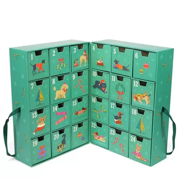 Calendrier de l'Avent amusant et durable, personnalisable et réutilisable, année après année. Il arbore une conception d'ouverture soignée de style livre et 24 tiroirs prêts à être remplis avec un choix personnel de notes, de bonbons ou d'autres petits cadeaux. Des images joyeuses de Noël sont présentes sur chaque tiroir – des plus ludiques, comme un adorable chien en tenue de fête, jusqu'aux espiègleries de Noël, en passant par les classiques, comme une paire de cannes à sucre, une collection de boules ou une couronne de houx. Parfait pour compter les jours jusqu'à Noël, encore et encore.