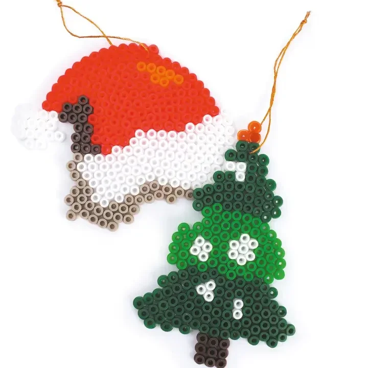 Créez 12 jolies suspensions de Noël en Perlou pour décorer votre sapin en famille grace aux deux plaques et au livret de réalisations. Suspendez-les avec le fil doré.