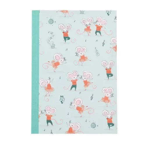 Un carnet A5 ligné avec notre impression des personnages de souris dansantes Mimi et Milo sur les couvertures avant et arrière.